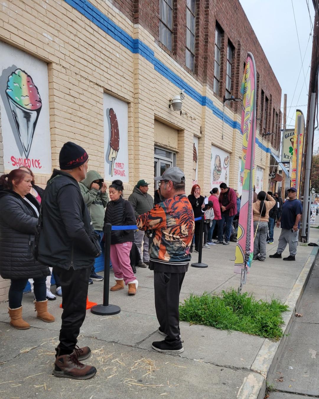 We followed the weather forecast around 5 days before the event and realized that we were going to get hit by the eye of a large storm with high winds. We started praying. We bought several canopies along with some staff brought in theirs to help. We anchored the canopies from the front door following the building with heavy weights that were donated to the thrift store. It created shelter from the rain and some shelter of the wind. The rain stopped shortly after the event began and for most of the day. God hears our prayers! Even with the weather the line formed early and we decided to open early as well. The line continued to until shortly after 1: PM.